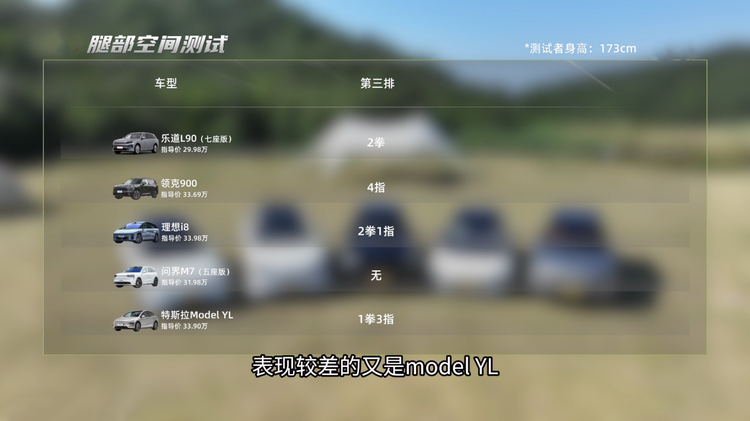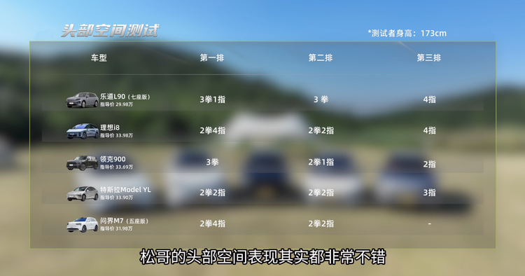 Model Y L的6座可是硬生生搞出来的,乘坐空间没什么优势,第三排只能临时应急;5座版问界M7的乘坐空间其实不错,但这次对比没有借到6座版,所以第三排没有数据;领克900由于较为方正的造型,使得前排头部空间多达3拳,但为了实现会客厅模式,第二排座椅下面的结构有点侵占纵向头部空间,第三排头部空间只有2指。