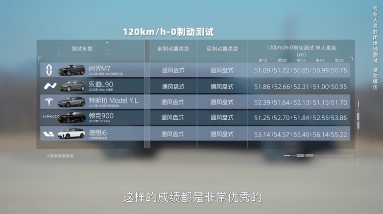 行业里120km/h-0的制动安全距离法规要求是60m,这五台车的刹车成绩都是优秀水平。不过俗话说跑得快,还要刹得稳。乐道L90不光加速够快,制动成绩也能名列前茅。这个车成功引起我的注意。