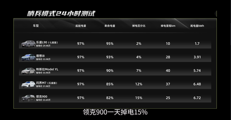 最后的项目就是大家很关心的哨兵模式到底费不费电。经过实测,领克900一天掉电15%,妥妥的“电量刺客”。而乐道L90一天掉电只有1.7kwh,真的是精打细算会过日子。换言之,领克900哨兵模式下的耗电量差不多是乐道L90的4倍。