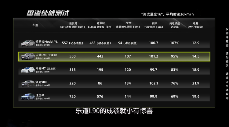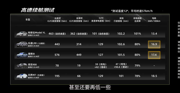 能耗测试结果又是一个“意料之外”。特斯拉的能耗管理一直很棒,Model Y L的城市电耗确实出色,但紧随其后的却竟然是乐道L90,95%续航达成率远超其他车型,主要是因为乐道对电池低压的控制很到位,城区低负载开车能耗有惊喜。