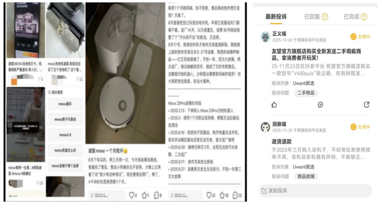 社交平台上“避雷mova,一个月就坏”“mova难用一生黑”的吐槽持续发酵,Uwant也深陷“友望官方旗舰店购买全新发送二手瑕疵商品”的维权争议。叠加投诉平台的诉求集中爆发,清洁电器行业在规模扩张期的发展阵痛愈发凸显。据黑猫投诉平台公开数据,仅MOVA相关投诉累计已超200条,2025年“双十一”促销后,行业投诉量更是显著冲高,TOP20品牌累计收到投诉1954单,整体投诉解决率仅29%。大量消费者诉求未能及时响应,行业信任危机正逐步蔓延。