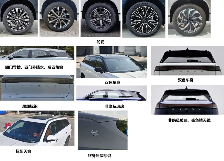 车尾部分,标志性的贯穿式尾灯得以保留,并采用了熏黑处理,搭配下方双边共两出的排气布局,保持了稳重运动的风格。车身尺寸方面,新车的长宽高分别为4853/1930/1718(1730)mm,轴距为2820mm。根据申报信息,新款瑞虎9将提供丰富的选装配置,包括天窗、不同样式的轮圈、四门导槽、双色车身、鲨鱼鳍天线以及多种尾部标识等。