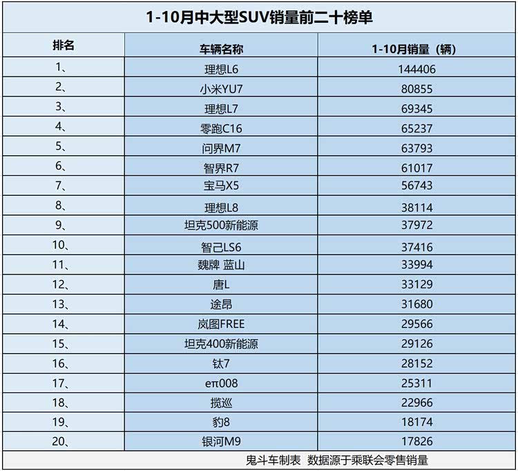 市场看着虽然热闹,但中大型SUV市场的销量表现很一般,日前,乘联会发布车市1-10月零售销量数据,小编整理出1-10月中大型SUV市场销量排名前二十榜单,让很多网友大跌眼镜的是,1-10月,中大型SUV市场仅有一款车型累计零售销量超过十万。接下来,看看具体车型排名。