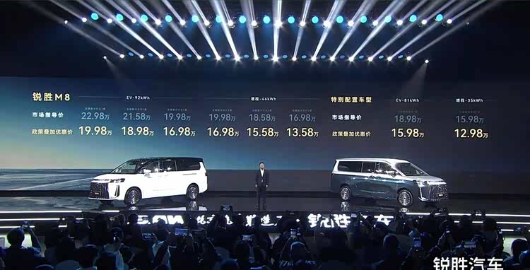 车家号·0浏览·2025-12-05 23:21 · 广东12 月 5 日, 锐胜 M8 正式上市,新车售价 12.98-19.98 万元,共提出 8 款车型版本,覆盖增程+纯电车型。