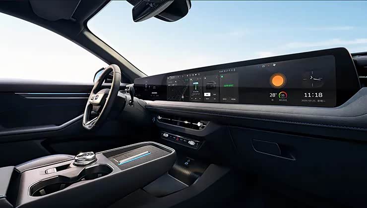 内饰造型上,福特蒙迪欧其实一样主打科技、时尚,跟一些新能源汽车有一些类似风格。较为吸睛的是中控台那一排的屏幕,12.3英寸的仪表+27英寸的大屏,这屏幕就直接拉满了中控台,他一样是拥有副驾驶屏幕的。屏幕足够大,智能化上内置的是新一代SYNC+智行互联系统,拥有全新智能语音助手VA 4.0,匹配大语言模型,车机芯片是高通骁龙8155,流畅度、智能化等都属于主流类型。