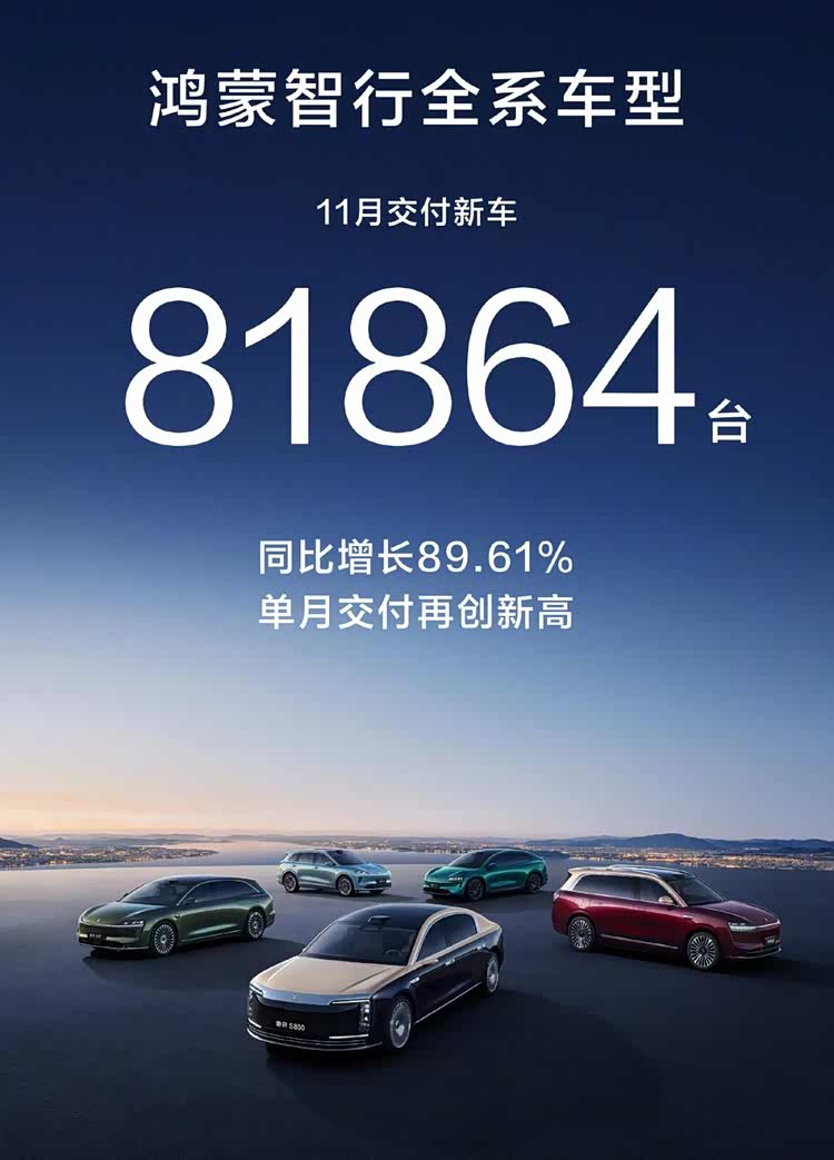 2025年11月鸿蒙智行全系累计交付量突破100万辆,以43个月时间创下新势力最快百万辆交付纪录。11月份,单月销量更是达到了81864辆,同时保持着89.61%的高增速。