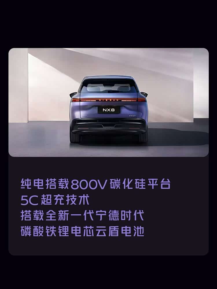 动力方面,东风日产NX8增程版搭载的是1.5T增程器,峰值功率109kW,驱动电机峰值功率195kW,配备磷酸铁锂电池。纯电版本搭载的是单电机,峰值功率有215kW和250kW可选,另外纯电版本将采用800V平台打造,支持5C快充。