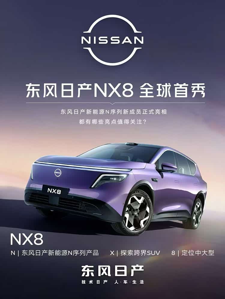 车家号·0浏览·2025-12-06 10:33 · 重庆继N7、N6之后,东风日产又一款新能源车要来了,不过这次是一台SUV车型,东风 日产NX8(参数|询价),并且新车将会采用增程+纯电双动力可选。