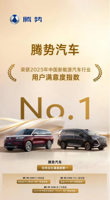 在竞争激烈的新能源汽车市场,用户满意度是衡量产品实力的黄金标准。近日,由中国质量协会权威发布的2025年中国新能源汽车行业用户满意度指数(NEV-CACSI)测评结果出炉,腾势D9 DM-i、腾势D9 EV、腾势N9分别斩获混动MPV、纯电中大型MPV、2025年市场关注新车(SUV)第一。同时,腾势汽车销售服务也斩获用户满意度第一。