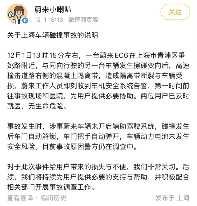 而就在12月1日,上海一起车祸中,一辆 蔚来EC6(参数|询价)发生碰撞,发生碰撞后车门正常能够打开,电池也未起火,但是车辆直接断成两截,属实是有点看不下去了。
