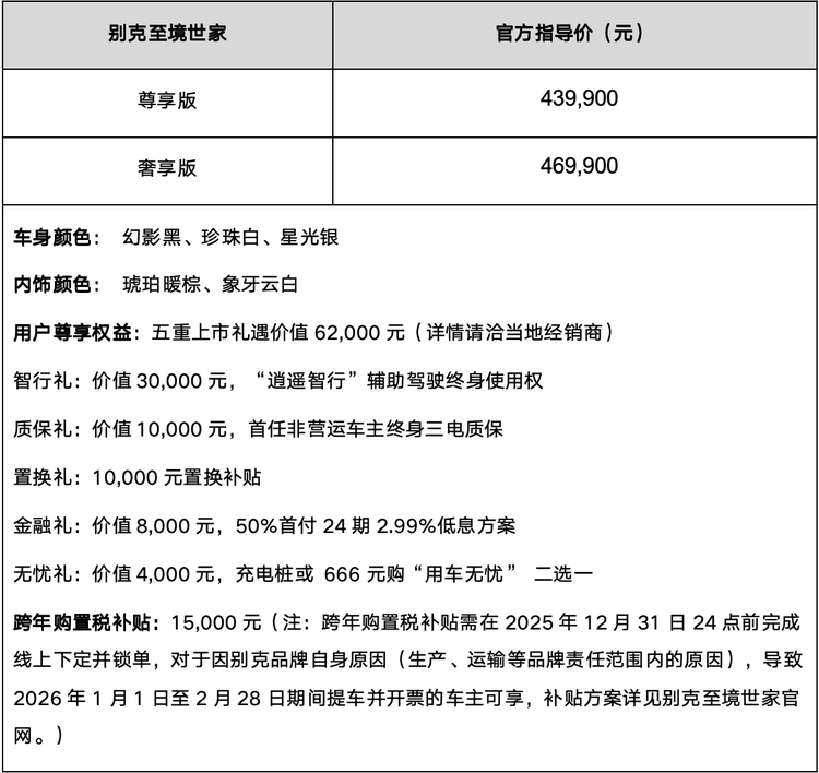 即日起,用户可通过别克官网、iBuick App、Buick小程序、别克抖音直播间,或别克全国授权经销商门店下定。在2025年12月31日24点前完成线上下定并锁单,且于2026年2月28日24点前提车并开票的车主,即可享受限时五重上市礼遇。同时在2025年12月31日24点前完成下定并锁单,且于2026年1月1日至2月28日期间提车并开票的车主,可享15,000元跨年购置税补贴。