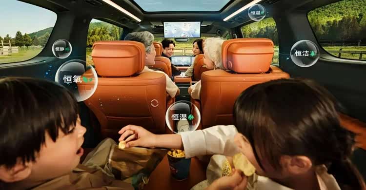 此外,新车还在座舱健康上做足了功夫。松下nanoe™X净化技术、南德TÜV护眼认证1.1米超长智慧顶灯、莱茵TÜV低蓝光护眼认证前排三屏贯通式娱乐屏和后舱智慧屏、OEKO-TEX婴儿级认证座椅皮革等诸多先进健康科技共同打造出恒温、恒湿、恒氧、恒洁、恒静的“五恒”大健康座舱。