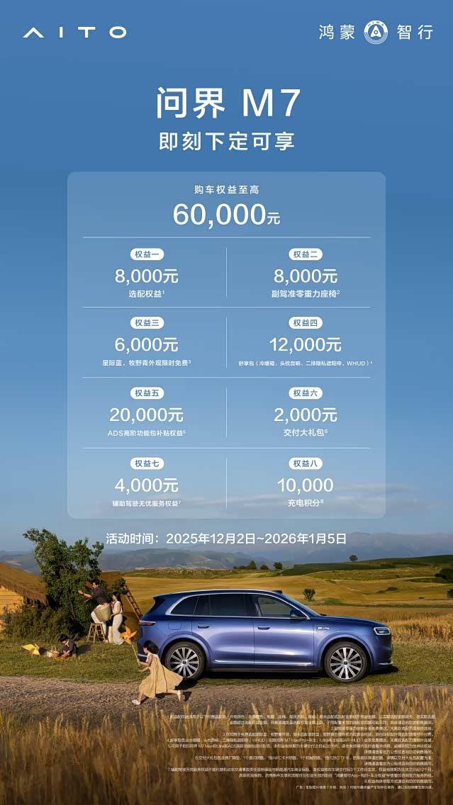 此外,问界品牌还展现出前瞻性的用户关怀。针对2026年购置税政策可能的影响,品牌还为在2025年12月1日至31日完成大定锁单,因非用户原因导致2026年交付的准备了最高15000元的购置税补贴,切实保障用户利益。
