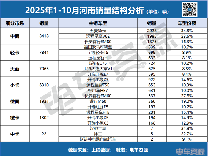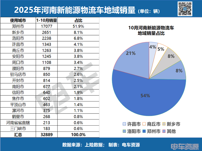 从销量结构看,无论是今年10月,还是1-10月,郑州新能源物流车销量在河南市场占据半壁江山。