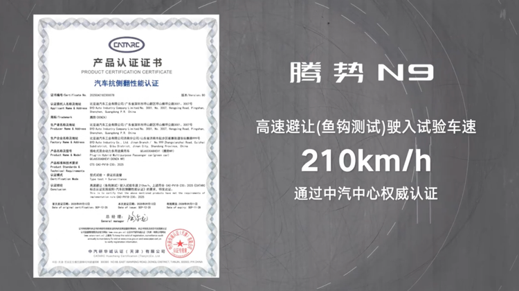 在安全方面,腾势N9的表现尤为突出。其全系标配易三方,科技安全极致演绎。在危险的高速避让场景中,腾势N9把鱼钩测试驶入速度提升至210km/h,三破高速避让世界纪录,带来高速避让不侧翻的安全守护。依托易三方,腾势N9还能做到高速爆胎不失稳、暴风侧吹不跑偏、湿滑路面不打滑,“安全之王”实至名归。