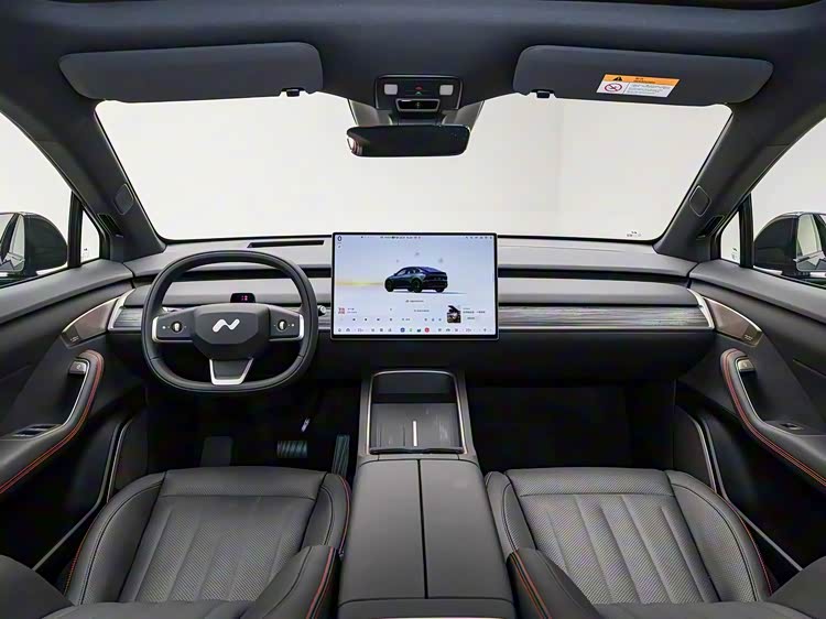 进入车内,内饰以 “黑橙撞色” 为核心设计语言,车内为无仪表盘设计,配备17.2英寸中控屏,将继续采用高通骁龙8295P座舱芯片和NT.Coconut椰子系统。而全黑内饰基调上,安全带、座椅缝线与门板饰条采用橙红色点缀,如同黑夜中的流光,瞬间激活座舱氛围,比单纯的纯黑内饰更具激情与巧思。全车采用 5 座布局,座椅选用高品质仿皮材质包裹,触感柔软且支撑性优异,前排座椅支持多向电动调节,靠背与坐垫的侧翼包裹性出色,无论是激烈驾驶还是长途乘坐都能提供舒适体验。得益于 2900mm 超长轴距,后排腿部空间充裕,身高 180cm 的乘客乘坐时膝盖与前排座椅仍有两拳余量,头部空间也不显局促,中央扶手配备储物格与杯架,提升了后排乘坐的便利性。
