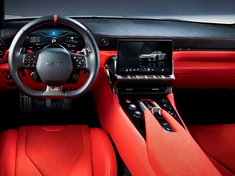 进入车内,内饰以 “极致运动 + 人体工学” 为核心,采用红色皮革与翻毛皮材质拼接,营造出浓郁的赛道氛围。座舱设计完全偏向驾驶者,所有核心控制按键均布局在触手可及的范围内,平底式运动方向盘中央配备 “GT+GR” 专属标识,取代传统丰田车标,碳纤维饰板点缀其间,进一步提升轻量化与运动质感。座椅选用 Recaro 赛车级运动座椅,采用碳纤维框架,包裹性极强,能够在激烈驾驶时为身体提供充足支撑,同时支持多向调节以兼顾日常舒适性。仪表盘为定制化液晶显示,后排空间虽以实用为主,但得益于合理的轴距分配,身高 175cm 的乘客仍能获得基本舒适体验,后备箱常规容积可满足短途出行储物需求,兼顾赛道日与日常通勤双重场景。