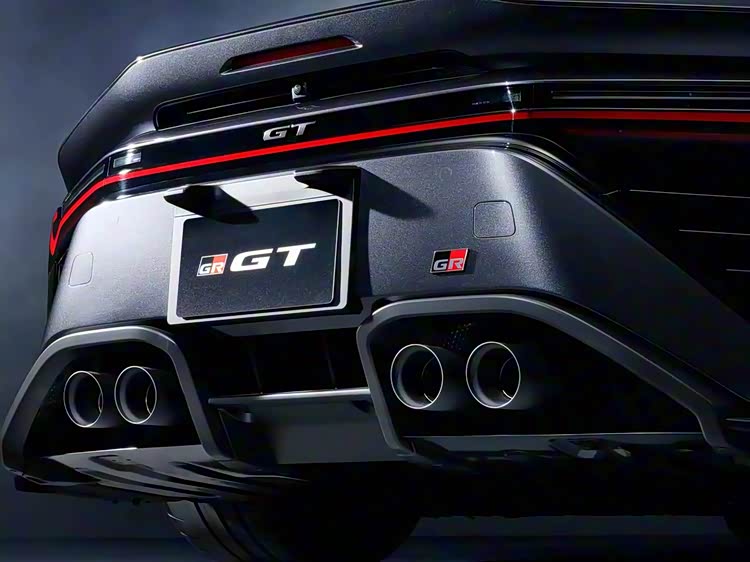 再来看车尾部分,车尾设计与车头形成强烈呼应,每一处细节都服务于空气动力学优化与性能释放。贯穿式 LED 尾灯组采用两侧勺状设计,夜间点亮后形成连贯光带,辨识度极高,尾灯周围的黑色装饰实则为气流出口,负责为混动系统、变速箱及刹车散热。车顶配备贯穿式小鸭尾扰流板,配合下方超大尺寸扩散器,大幅提升高速行驶时的下压力,确保车身稳定性。双边共四出排气布局采用居中设计,排气口粗壮有力,声浪预计将延续 GR 家族的澎湃质感。车尾中央醒目的 “GT” 标识与右下角的 “GR” 徽章,彰显其专属性能身份,整体造型简洁凌厉,无多余装饰,将赛道基因与空气动力学完美融合。