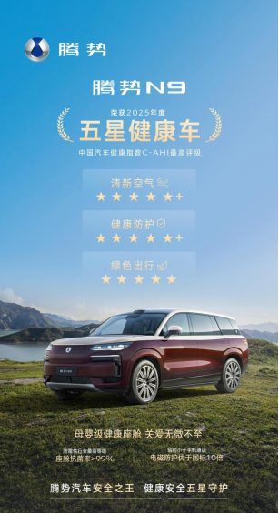 在健康出行为消费核心需求的当下,腾势N9以最高评级获得钟南山院士见证的“五星健康车”评奖,在“清新空气”、“健康防护”、“绿色出行”三大维度均展现领先实力。其中清新空气、健康防护双双斩获5星+,以母婴级健康标准将“更安全、更健康的出行”落实为可检验的行业成果,树立健康安全新标杆。
