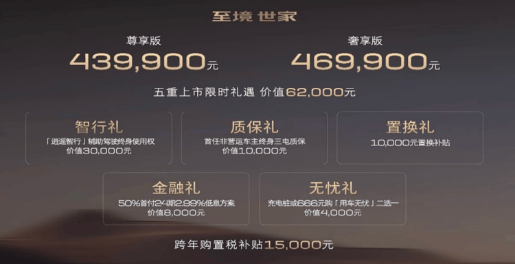 12月5日晚, 别克至境世家(参数|询价)正式上市,新车43.99万元起售,年前购买可享受1.5万元购置税优惠在内的诸多权益。