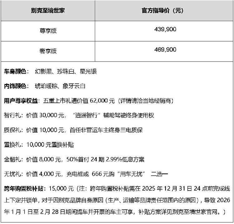 在2025年12月31日24点前完成线上下定并锁单,且于2026年2月28日24点前提车并开票的车主,即可享受限时五重上市礼遇。同时在2025年12月31日24点前完成下定并锁单,且于2026年1月1日至2月28日期间提车并开票的车主,可享15,000元跨年购置税补贴。