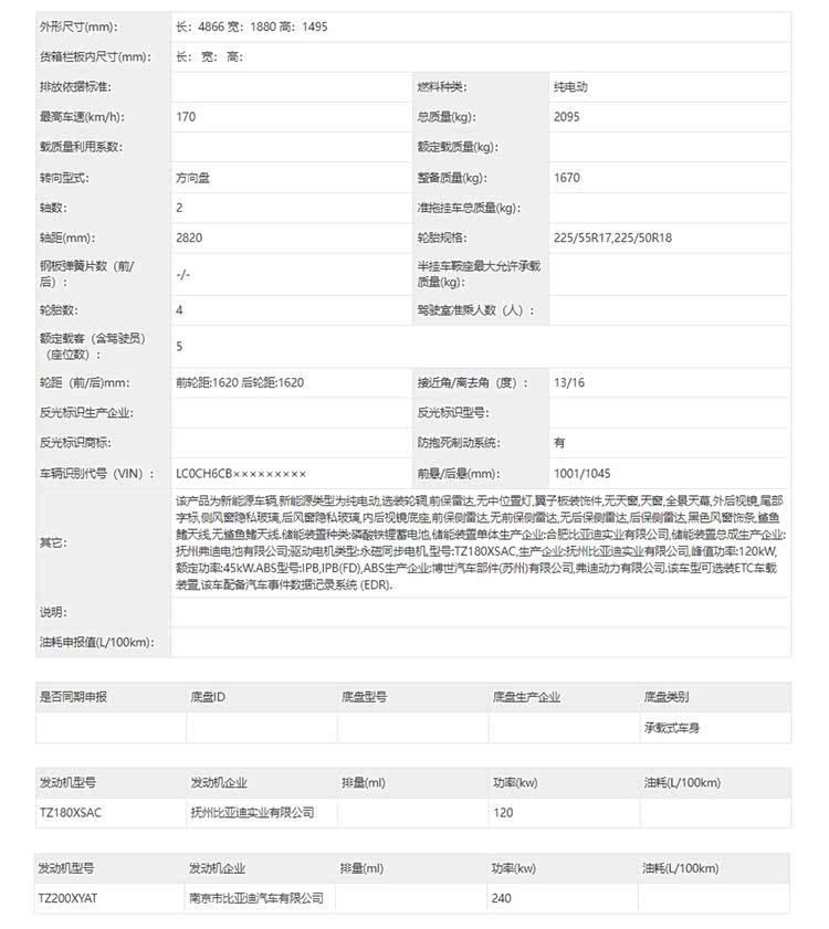 动力配置部分,新车搭载的是纯电动力,申报了两种电机,最大功率分别为120千瓦和240千瓦,高功率版的动力参数很抢眼。