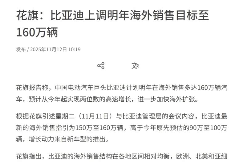 海外市场的节节攀升,也让比亚迪对海外市场的表现非常看好。日前联合早报援引世界金融巨头花旗集团的报告称,因为海外销售成绩良好,比亚迪内部已经上调了关于2026年海外销售的销量目标,将销量目标提升到了160万辆,不到今年实际销量目标的2倍。