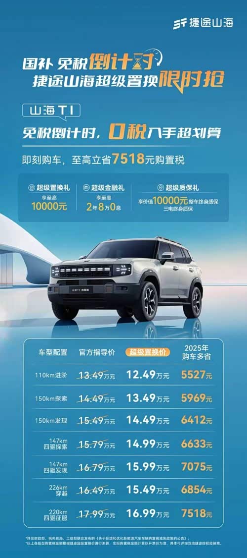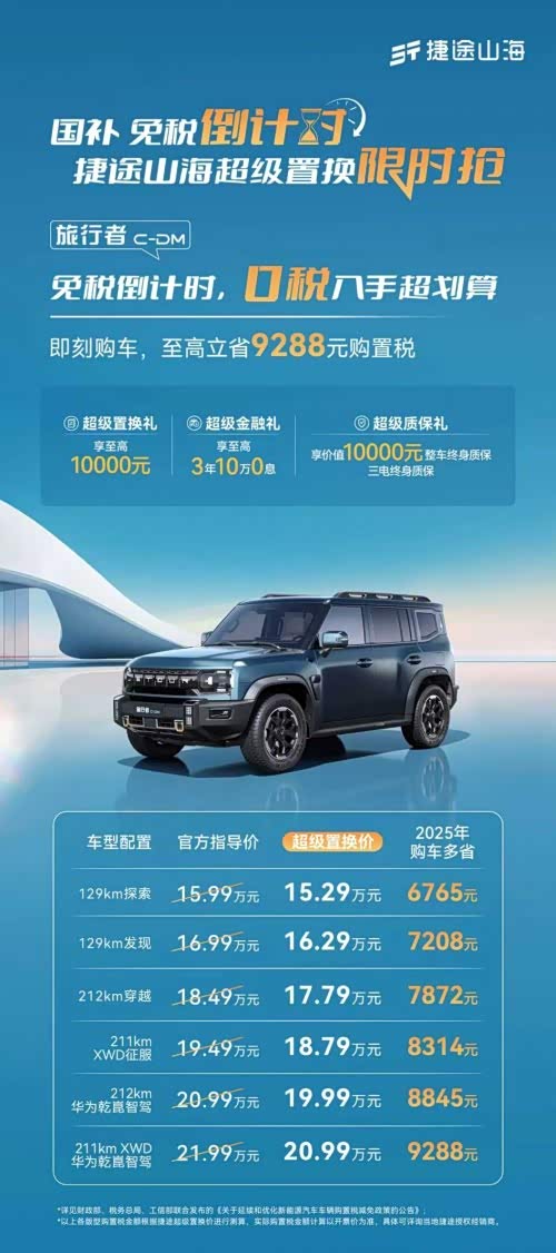 捷途山海超级置换专场!0 税超划算,捷途山海 T1 12.49 万起、捷途旅行者 C-DM 15.29 万起、捷途山海 L7PLUS 10.99 万起~