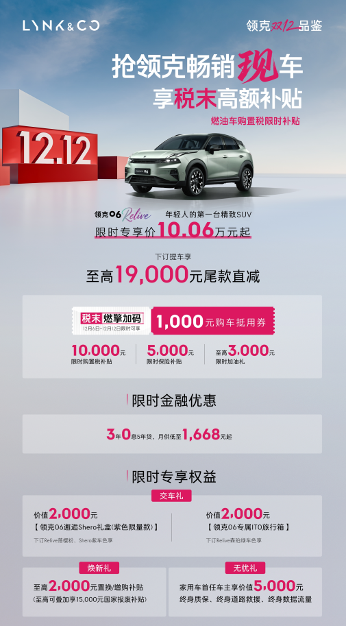 购车福利政策极具吸引力,领克 06 Relive 限时专享价 10.06 万元起。消费者下订提车可享受 10000 元购置税补贴、5000 元保险补贴,以及至高 3000 元加油礼。12 月 6 日 - 12 月 12 日期间,在领克官方直播间下订的消费者,可额外获得 1000 元购车抵用券,进一步降低购车成本。同时,下订提车的消费者可获得惊喜奇遇礼参与资格,有机会抽取价值 1198 元的上海迪士尼双人门票。金融政策方面,提供 5 年期贷款 10 万 3 年 0 息方案,月供低至 1668 元起,有效减轻年轻消费者的购车资金压力。所有车主最多可得2000元置换/增购补贴,而领克、极氪、吉利、银河车主置换/增购领克06额外赠送15000Co积分。下订落樱粉车色和Shero紫车色可享价值2000元邂逅Shero礼盒,下订Relive森珀绿车色可享价值2000元专属ITO旅行箱。