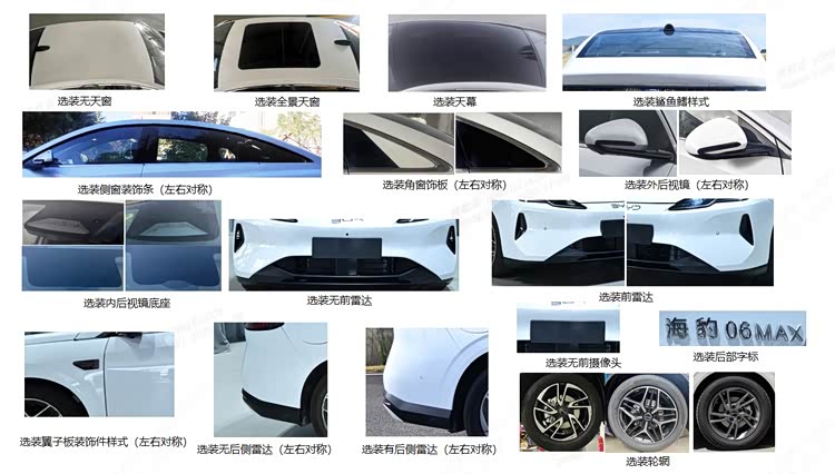 在申报的细节方面,我们可以看到新款的海豹06 EV有无天窗版本,还有全景天窗版本以及全景天幕版可选择,它的车窗的周围可选择黑色的装饰条,前侧的部分还可以选择不同风格的包围,并且它还有各种样式的车轮毂可选择。新款比亚迪 海豹06(参数|询价) EV的长宽高分别为4870/1890/1495mm,轴距为2820mm,整车块头还是很不小的。在动力方面,新车有120千瓦和240千瓦的单电机可选择。
