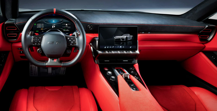 内饰设计,这款Toyota GR GT采用了火红的内饰布局,并且拥有双大屏的设计,这其实已经向时代进行了妥协,但依然匹配了大量的实体物理按键,象征着传统。