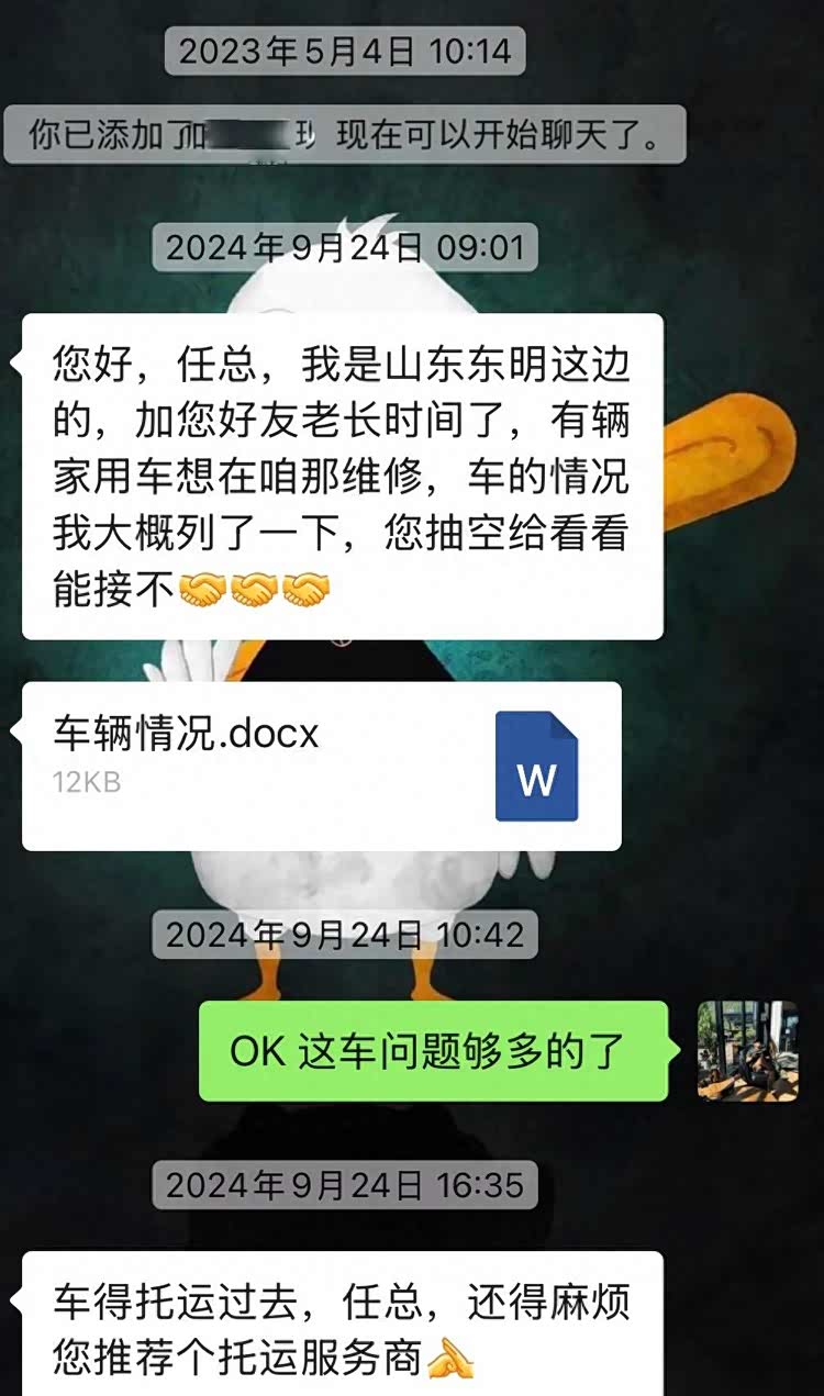 2023年5月份车主就加我好友了,一年多没说过一句话,2024年9月...没有多余的开场白,直接进入主题要送一辆车过来翻新!