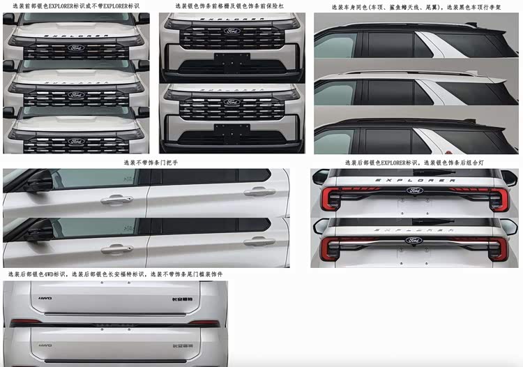 关于申报的具体内容,我们观察到新车提供了大量的格栅选择,并且被分为几个不同的类别。这款新车的车顶提供了黑色选项,这种设计使其更具运动感,同时车窗周边也有黑色装饰条可供选择,而车的尾部则根据不同的车型设计有独特的标志。最新版的福特探险者车型具有5064/2004/1790mm的长、宽、高,轴距达到3025mm,整体车身尺寸相当庞大,被定位为中大型SUV。在动力输出上,这款新车仍然配备了2.3T的涡轮增压引擎,其最大功率输出达到了213千瓦(相当于289马力)。