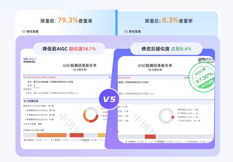 锐智AI通过智能算法对文章深度处理,有效减少可识别度,使文章更贴近学术表达,能大幅提升文章原创感,降低 AI 生成内容的识别率,而且优化以后,集写作、润色和降重功能于一体,可智能优化写作内容、将中式英语改写为地道英文、一键优化冗余表述等,比如将“通过大数据分析”改写为“基于XX实验数据集”,使行文更贴近大家的日常表达习惯。我的亲身经历,使用锐智AI工具后,论文AIGC率可从80%降至18%以下,重复率同步下降,直接给我节省两三天的时间,还能腾出时间撸猫、追剧、拍毕业照。而且它是支持例如知网、维普、万方、PaperPass等等主流检测平台的。