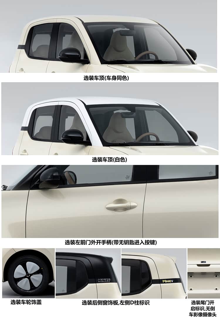 配置方面,选装信息显示新车提供尾门开启标识、两种左侧D柱标识、车轮饰盖、后侧窗饰板、两种车顶(车身同色,白色)等配置可选。