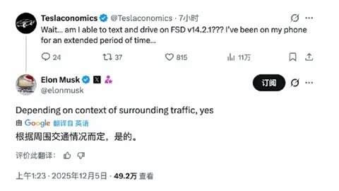 马斯克在X上证实了这一功能,称FSD将根据周围的交通状况来判断是否允许车主进行发短信等操作。他此前曾预告将在1-2个月内开放此功能,如今已然兑现。
