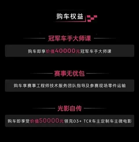 · 购买权益:包含赛道驾驶培训、工程指导服务、赛道基础技师服务等“三重权益”