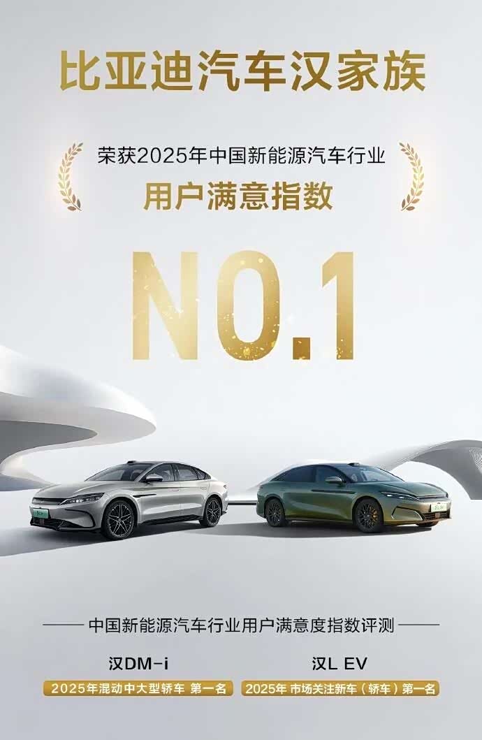 今日,比亚迪官方宣布,其汉家族在中国质量协会2025年新能源汽车行业用户满意度指数(NEV-CACSI)测评中再创佳绩: