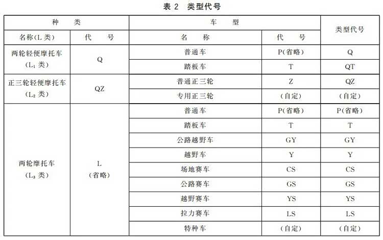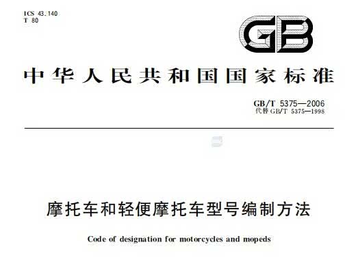 当前实行的是2006年发布,2007年开始实施的国家标准GB/T5375-2006《摩托车和轻便摩托车型号编制方法》。根据该国标要求,摩托车型号应由企业(或商标)代号、规格代号、类型代号、设计序号及企业自定代号5个部分组成。
