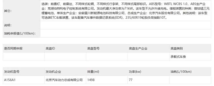 车尾部分扩大后风挡视野面积的黑色边框依旧延续,中央镶嵌有北京标,纵向的尾灯提升了硬派的感觉。在车身尺寸方面,三围达到4730/1910/1790毫米,轴距为2820毫米,没有明显的变化。而在动力方面,该车采用了全新的A156A1发动机,最大功率105马力1.5升自然吸气,比此前的1.5T要低了不少,应该会在热效率方面有更加出色的表现。