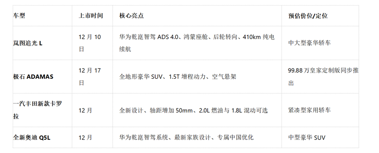 12月10日,岚图汽车新时代旗舰轿车追光L即将压轴上市。这款车全系搭载华为乾崑智驾ADS 4、鸿蒙座舱HarmonySpace 5,并标配四驱系统与全域800V岚海智混技术。除了岚图追光L,本周还将迎来多款值得关注的新车,涵盖从高端豪华到家庭实用的不同市场定位。