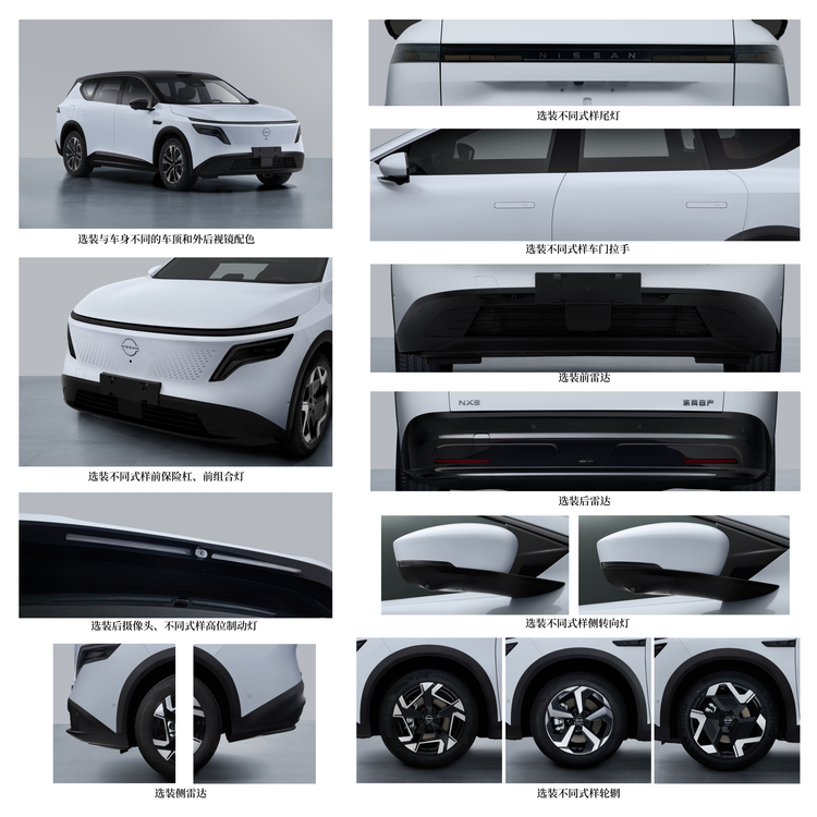 纯电版与增程版在设计上并没有做出区分,都可选装不同样式的前保险杠、组合灯等等。尺寸上,日产NX8的长宽高分别为4870mm、1920mm、1680mm,轴距为2917mm,定位中大型SUV,提供三种样式的轮毂造型以供大家选择。