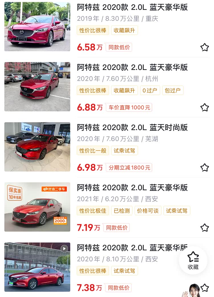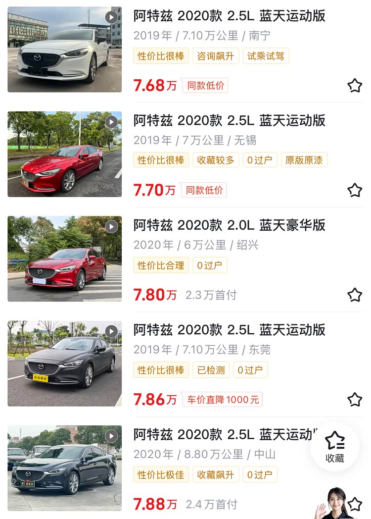 不过在二手车市场,那就不一样了。2020款的阿特兹,一年跑1万公里左右的车源,2.0L版本报价,也就在七万左右,即便是高配,7万也能拿下。2.5L版本,报价基本都在8万以内,实际成交价7.5万左右。对比同年份,同公里数的1.5T本田雅阁,二手车报价基本都在10万左右。所以在二手车市场,阿特兹的产品力,就相当突出了。
