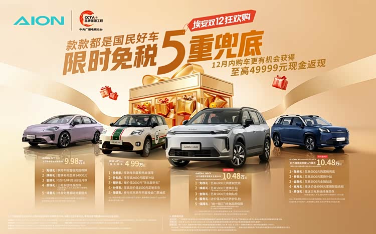 广汽埃安始终以“打造国民认可的好车”为使命,努力成为国民家庭最值得信赖的出行伙伴。此次埃安双12狂欢购,款款都是国民好车,车车都有免税5重兜底,让用户多快好省畅享智能电动出行美好体验。