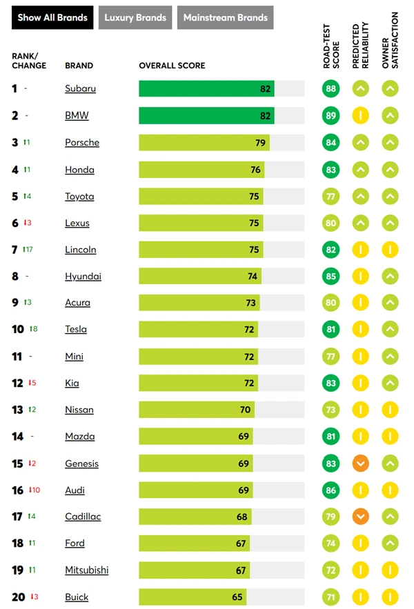 本年度,《消费者报告》可靠性排名第一为丰田,终结了斯巴鲁连续两年的榜首位置;而在综合评分中,斯巴鲁仍然位居第一,宝马紧随其后,第3-9名分别为保时捷、本田、丰田、雷克萨斯、林肯、现代、讴歌,第11-15名分别为Mini、起亚、日产、马自达、捷尼赛思。