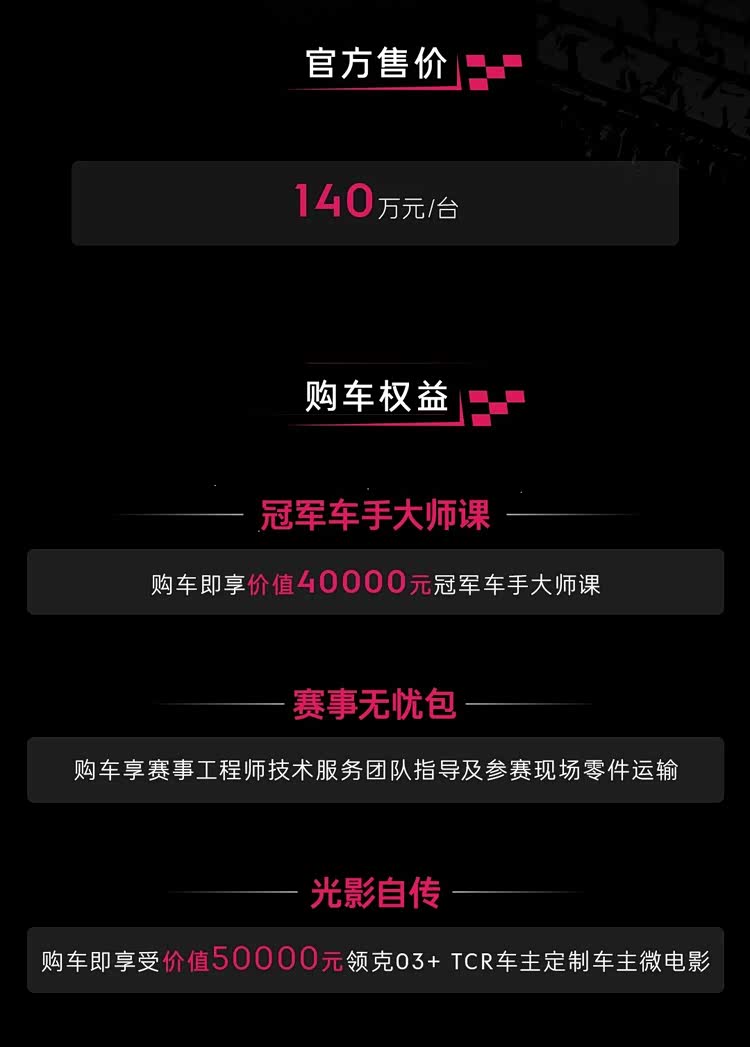 12月6日的2025 CO客大会上,领克汽车正式发布全球首台由中国品牌自主研发并量产的TCR赛车—— 领克03(参数|询价)+ TCR赛车,官方售价140万元(含税),即日起接受预订,定金为28万元。该车型将于2026年3月完成国际TCR赛事推广机构WSC注册,并于同年4月启动交付,标志着中国汽车品牌首次实现符合FIA认证标准的量产TCR赛车从研发到销售的完整闭环。