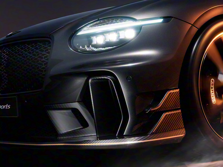 该套件包含碳纤维前保险杠分流器,它位于车头下方,为车辆高速行驶时的气流导向提供基础结构。虽然宾利没有公开风阻优化或下压力变化的数据,但外观套件普遍通过延伸前唇边缘,使通过车头下方的气流更趋向贴地,从而使车头姿态在高速状态下更稳定。结合欧陆GT与飞驰的整车前悬结构,该部件不仅为视觉增添更具力量感的线条,还在空气流动方向上与原厂风道保持一致。在日常使用中,车主更能感受到的是车头的整体视觉变化,而非具体气动力数值,因此对城市道路驾驶体验影响有限,但高速场景中风道分流逻辑更稳定。