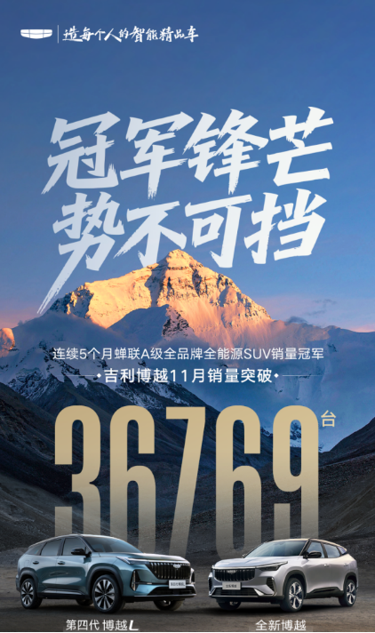 在10万元级别的家用SUV领域,入门即低配似乎已成为一种不成文的行业规则,消费者常常不得不在有限的预算和期望的核心体验之间做出艰难取舍。然而,全新 博越(参数|询价)的登场,正致力于打破这一长久以来的僵局。它以60项全系标配+50项高端配置的豪华阵容,重新树立了该级别车型的配置标杆,目前吉利博越系销量可观,11月销售36769辆。