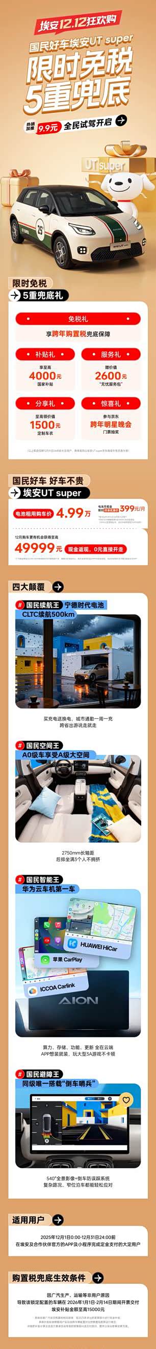 根据国家政策,2026年起新能源车购置税全免政策将退出,各地购车补贴也逐步落幕,今年12月将是享受政策红利最后的窗口期。值此双12大促,埃安推出“限时免税5重兜底”福利,助力消费者抓住购车末班车。其中与京东、宁德时代联合打造的埃安 UT super 受到市场关注。该车型以 4.99 万元起的售价,本周交付突破2000辆,已连续两周交付超1000辆。值得一提的是,埃安 UT super 的首批交付行业首次实现消费者在未进行实车体验下直接下单,并且不依靠线下积累订单的情况下取得了这一成绩。随着年末购置税减免等购车政策逐步进入倒计时,在京东双 12 期间,国民好车埃安_UT super 加推“9.9 元全民试驾”活动,用户可通过京东 APP 报名,费用全程随时可退花一杯奶茶钱预约,就能深度体验国民好车的四大颠覆性产品力。同时,在此次5重大礼加持下,12月31日前购车,综合估算相比明年购车可能节省超过1万元,无疑是本次京东双12“又好又便宜”最值得选购的单品。