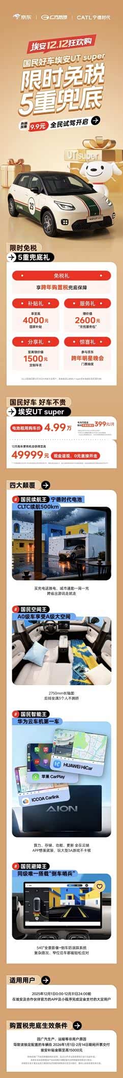 根据国家政策,2026年起新能源车购置税全免政策将退出,各地购车补贴也逐步落幕,今年12月将是享受政策红利最后的窗口期。值此双12大促,埃安推出“限时免税5重兜底”福利,助力消费者抓住购车末班车。其中与京东、宁德时代联合打造的埃安 UT super 受到市场关注。该车型以 4.99 万元起的售价,本周交付突破2000辆,已连续两周交付超1000辆。值得一提的是,埃安 UT super 的首批交付行业首次实现消费者在未进行实车体验下直接下单,并且不依靠线下积累订单的情况下取得了这一成绩。随着年末购置税减免等购车政策逐步进入倒计时,在京东双 12 期间,国民好车埃安_UT super 加推“9.9 元全民试驾”活动,用户可通过京东 APP 报名,费用全程随时可退花一杯奶茶钱预约,就能深度体验国民好车的四大颠覆性产品力。同时,在此次5重大礼加持下,12月31日前购车,综合估算相比明年购车可能节省超过1万元,无疑是本次京东双12“又好又便宜”最值得选购的单品。